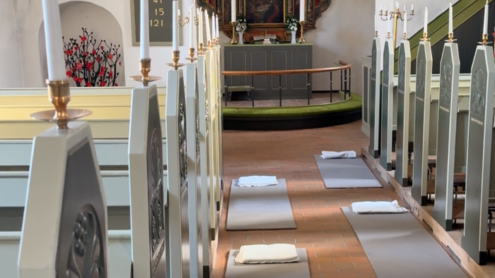 Når der er yoga på programmet er det blid yoga, hvor du også kan sidde på kirkebænken, hvis du har svært ved at ligge ned.